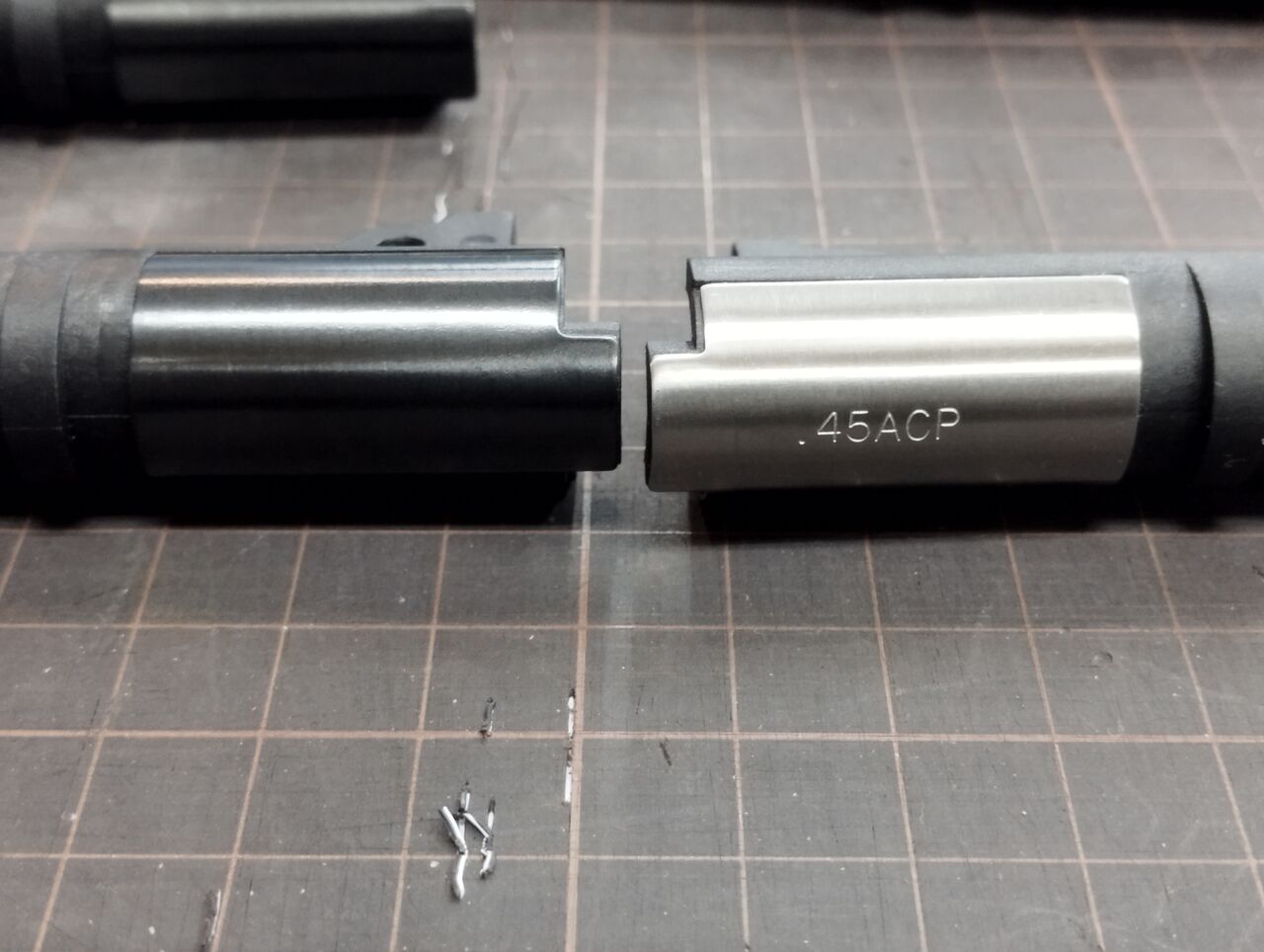 ただ、新しいバレルが入手できたとしても、てんちょーの愛銃は限定生産品のタニオコバベースの前期型MEUピストルなのでバレルのエジェクションポート部の刻印が「BAR-STO」刻印